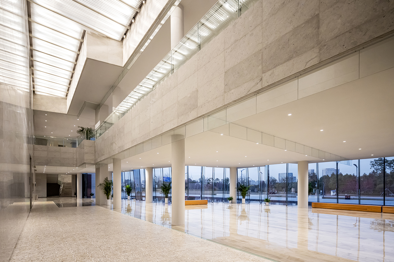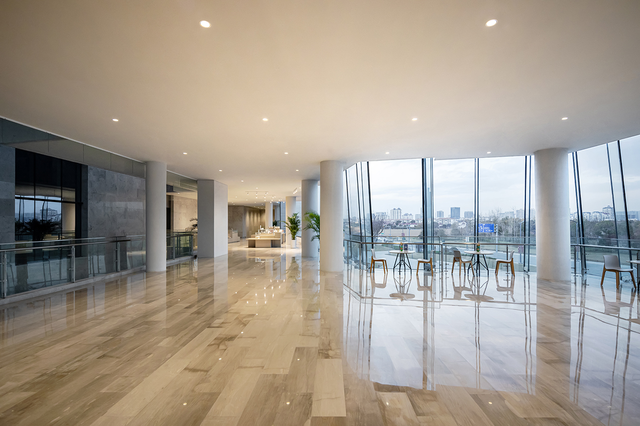 建築主要的公共空間佈置于景觀較好的基地北側(cè),別出心裁的超大玻璃幕牆,映照著遠(yuǎn)處京杭大運河熙攘的景色與寶帶橋的悠然靜謐。
