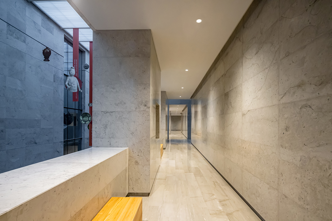 漫步在博物館寬敞明亮的過道,陽光透過玻璃的折面傾灑在牆面,建築外形冷冽切割的線條配合著室內(nèi)柔和的光線,體會到的是一種古老與現(xiàn)代交織的奇妙感受。